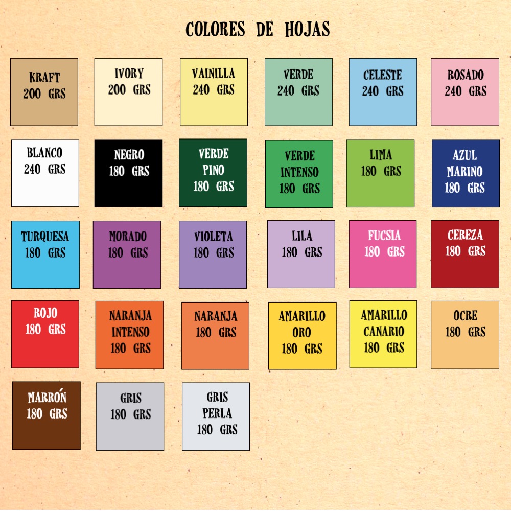 • Hojas papel kraft café de 200 grs (lisas, sin diseño). Cambio en color de hojas tiene costo adicional